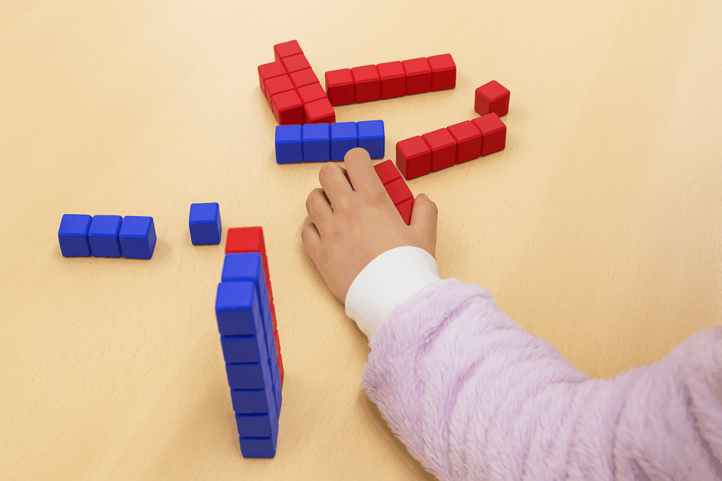棒積み木をつかって、くり上がりある足し算やくり下がりのある引き算などが頭の中でイメージしながらできるようにしていきます。この能力が磨かれていくと、頭の中で計算が素早くできるようになったり、文章問題への理解も早くなります。